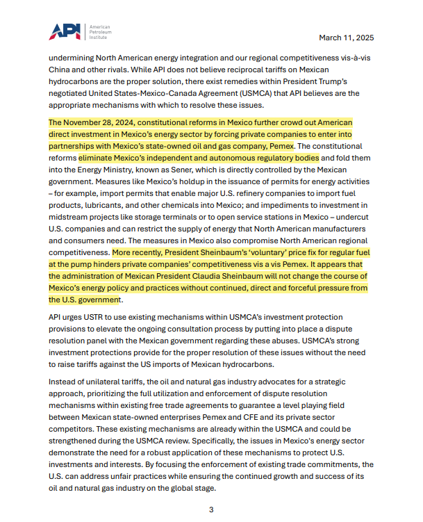 El Instituto Americano del Petróleo (API, por sus siglas en inglés), envió una carta al representante comercial de la Unión americana, Jamieson Greer, en donde se quejó del tope al precio de la gasolina, una medida impulsada por la presidenta Claudia Sheinbaum Pardo, y de las leyes secundarias recientemente aprobadas que fortalecen a las empresas públicas, Petróleos Mexicanos (Pemex) y Comisión Federal de Electricidad (CFE).